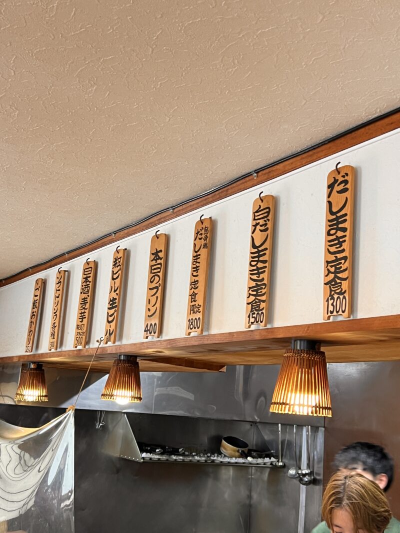 店舗前のスペースにパッと車を停めて数組並んでいる列にイン。イートインで約1時間待ち。持ち帰りもあるようで、それならすぐにオーダーできるっぽい。持ち帰りはだし巻き玉子単品かだし巻き玉子弁当らしいが、弁当は要予約。